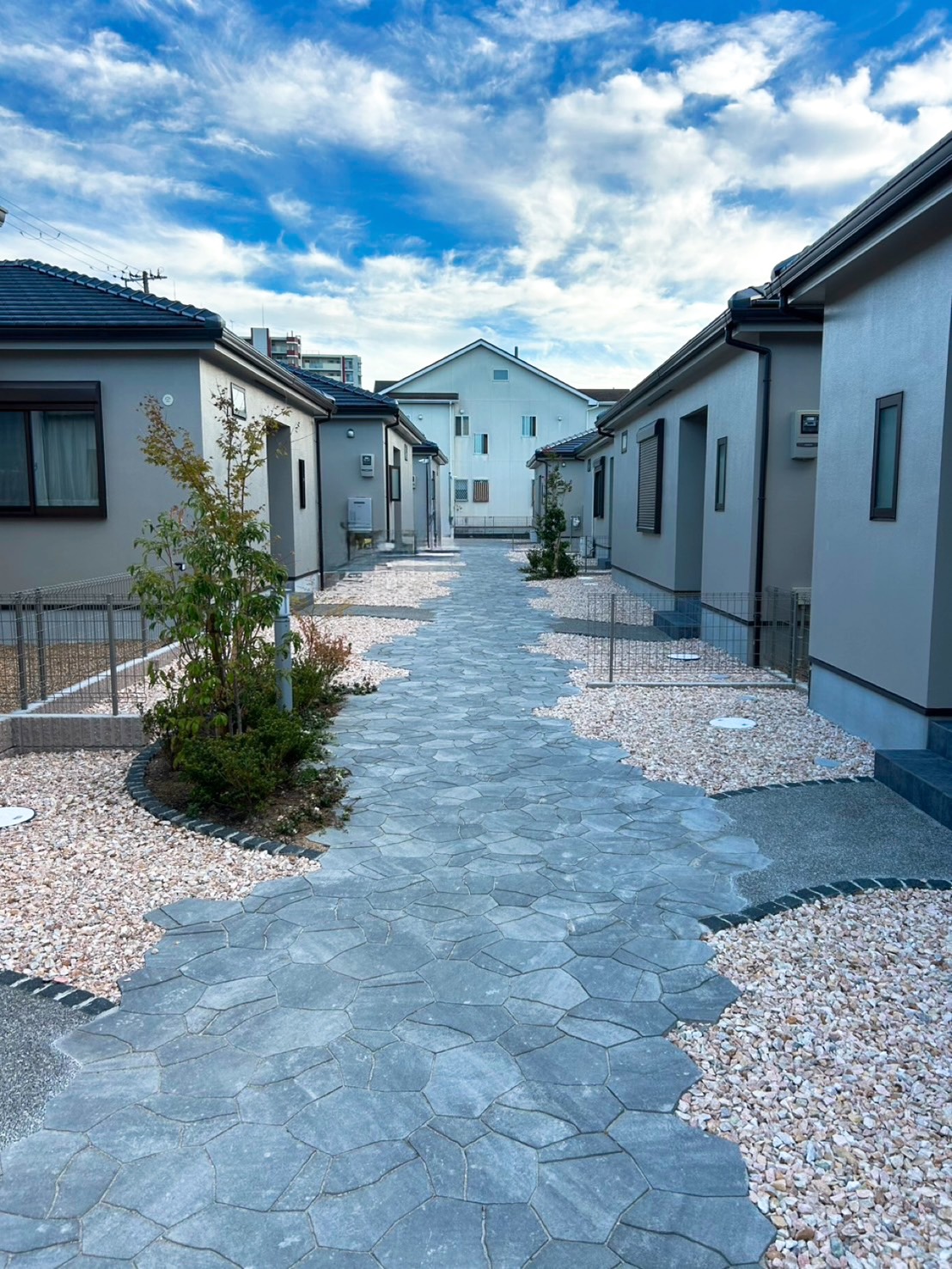 共用部分の通路に使用しているユニソンのインターロッキングティーナが、本格的な石張りの世界を演出しています。