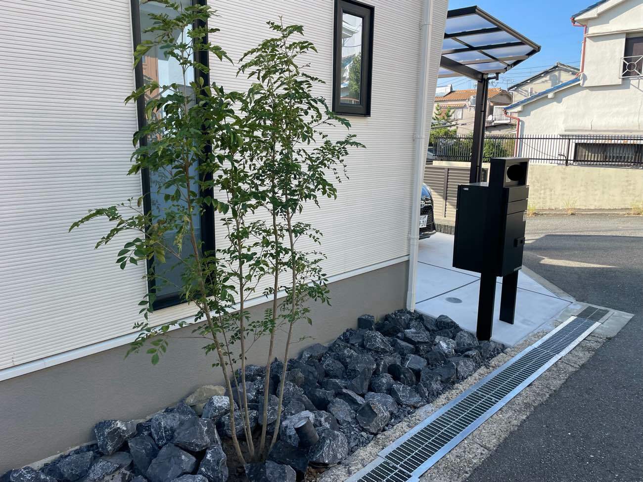 またロックガーデンに黒の石を選ぶことによって植栽や外壁の白が、さらに際立ってとても綺麗です。