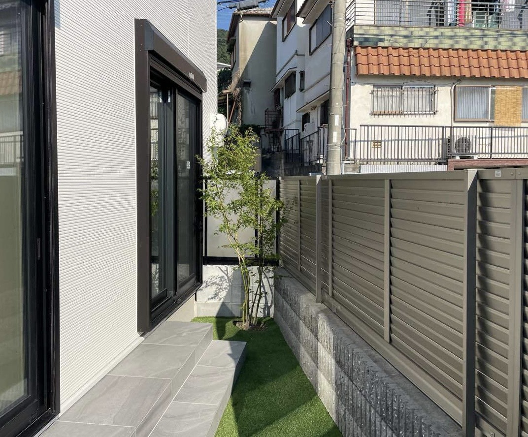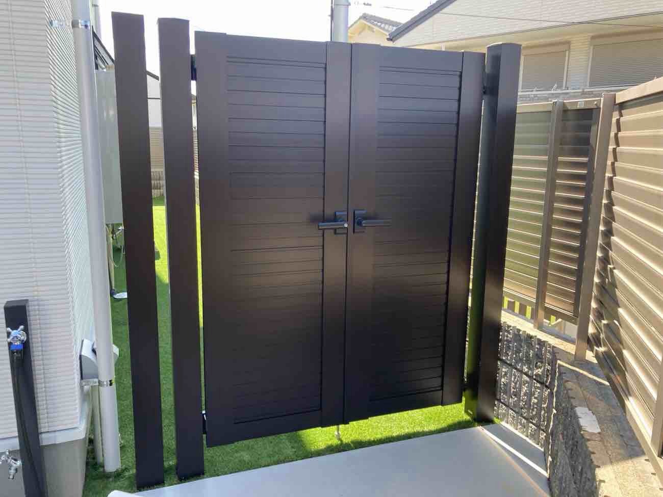 人工芝のスペース部分の目隠しフェンスには、隙間ガードを取り付け隙間をなくし大型門扉で外からの視線を完全にシャットアウトしプライベート空間が、より充実した空間となりました。